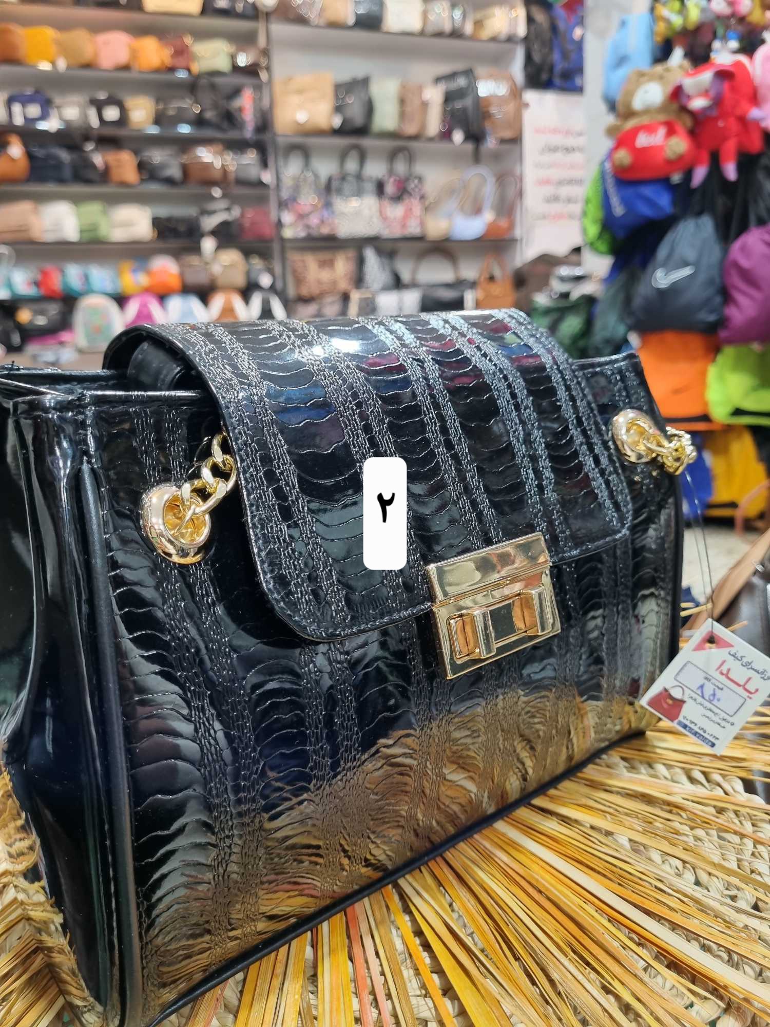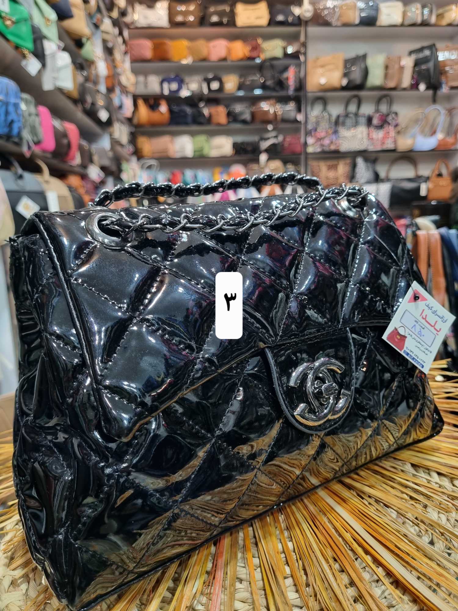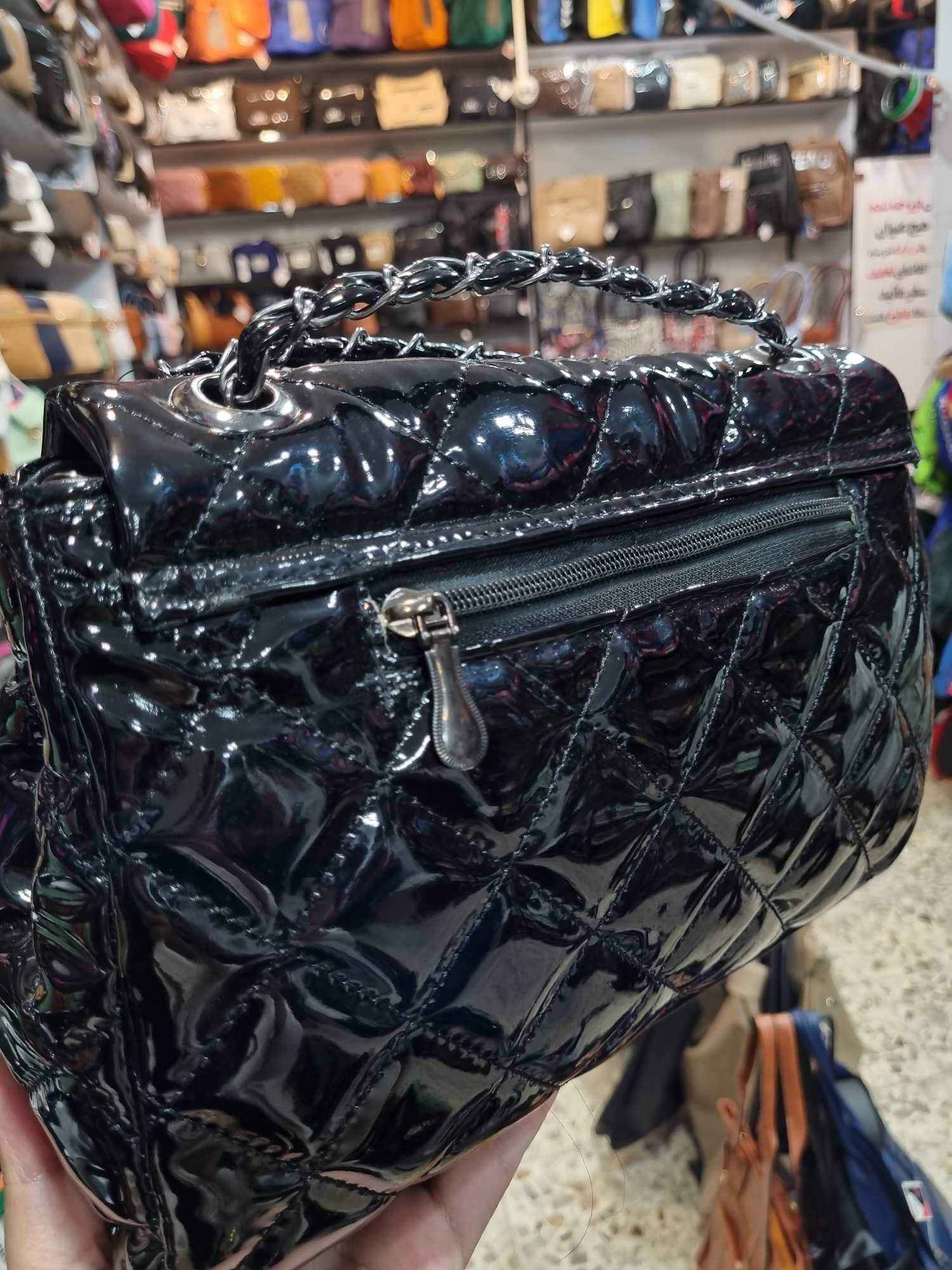 کیف ورنی شیک زنانه با قفل جلو و بند ترکیب چرم و زنجیر